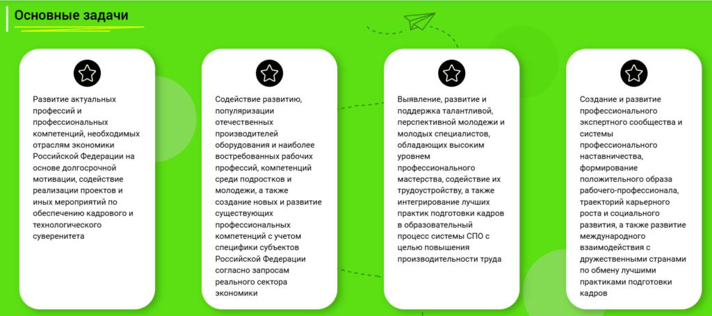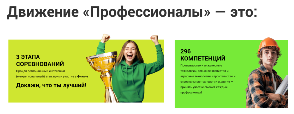 Всероссийское чемпионатное движение по профессиональному мастерству «Профессионалы» — более 1 миллиона участников, свыше 330 тысяч конкурсантов, 89 регионов России, более 7,5 тысяч предприятий-партнеров среди ведущих организаций страны и 296 инновационных и востребованных компетенций. Всероссийское чемпионатное движение — соревновательные мероприятия, направленные на демонстрацию компетенций конкурсантами в определенной экономической области.